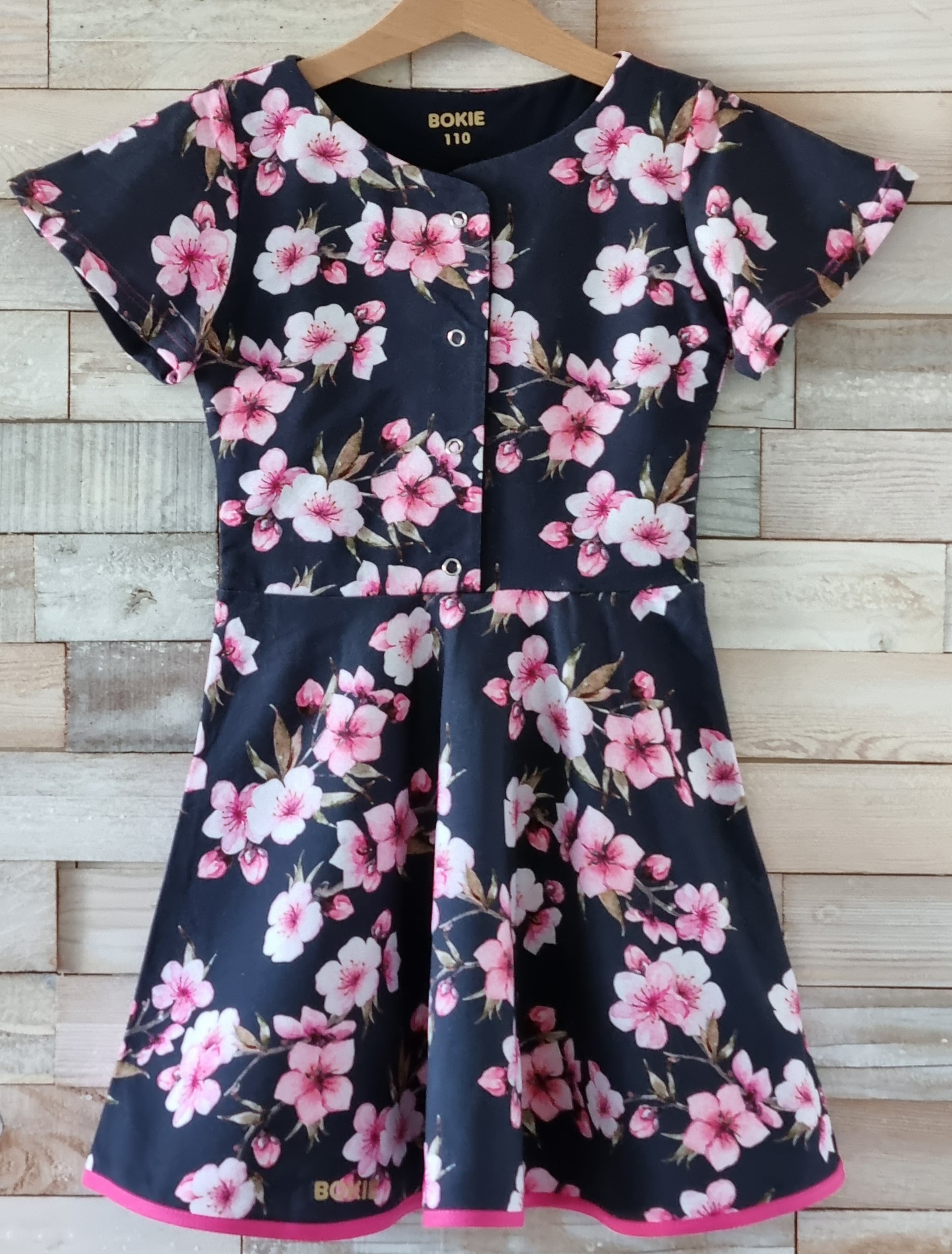 Het jurkje heeft een ronde hals vlindermouwtjes en een drukknoopjes sluiting aan de voorkant